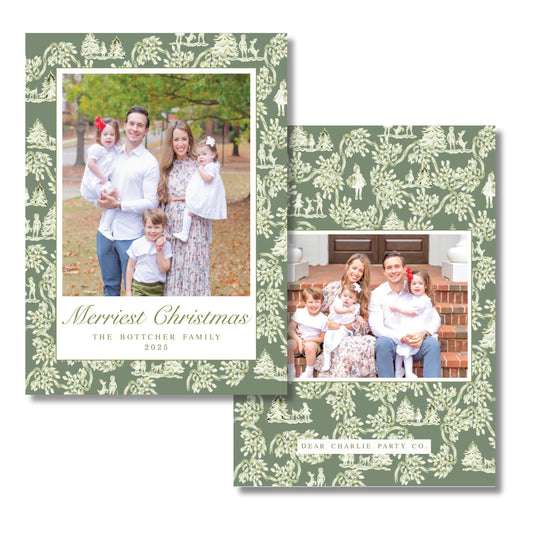 Holiday Toile Christmas Card, Green | 5x7 Holiday Photo Card with Envelope