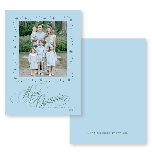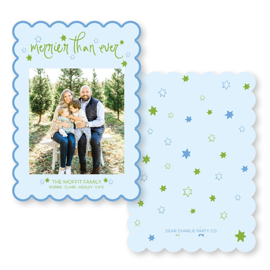 Starry Night Scallop Card in Bright Blue and Green | 5x7 Holiday Photo Card with Envelope