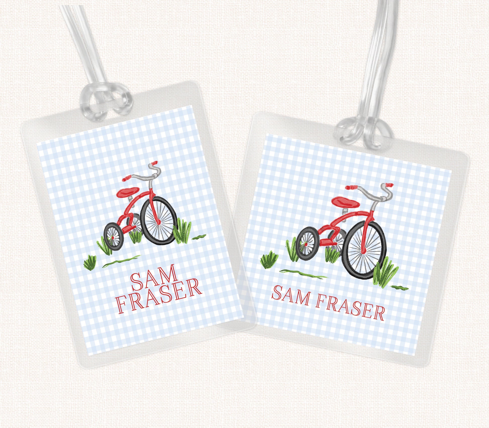 Blue Gingham Tricycle Bag Tag, Luggage Tag, Boy Bag Tag, Laminated Bag Tag, Boy Bag Tag