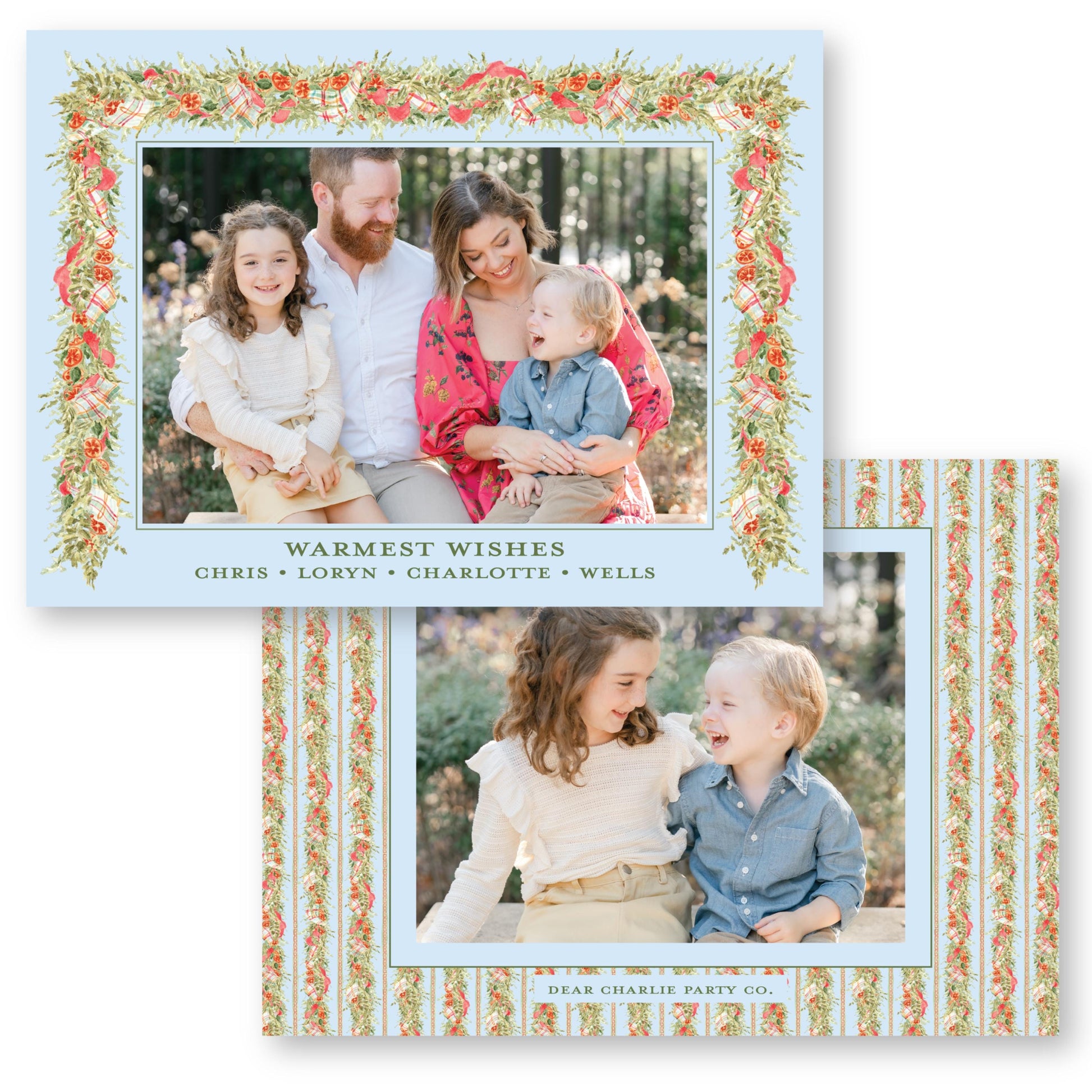 Pomander and Plaid Wreath in Blue Horizontal | 5x7 Holiday Photo Card with Envelope
